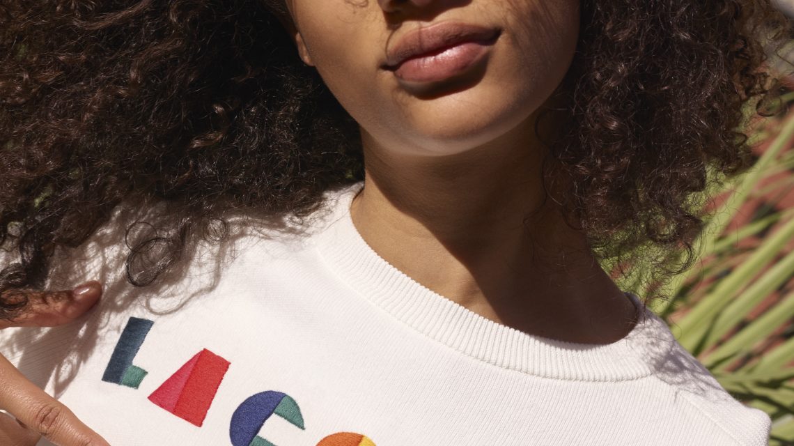 Uma abordagem altamente gráfica, na qual o colorblocking e as listras reinam supremos. O crocodilo cede espaço a uma versão estilosa e contemporânea do logo em forma de L ou de um alfabeto geométrico ultracolorido que dá vida à frente de uma camiseta, um moletom ou um suéter canelado com letras chamativas.